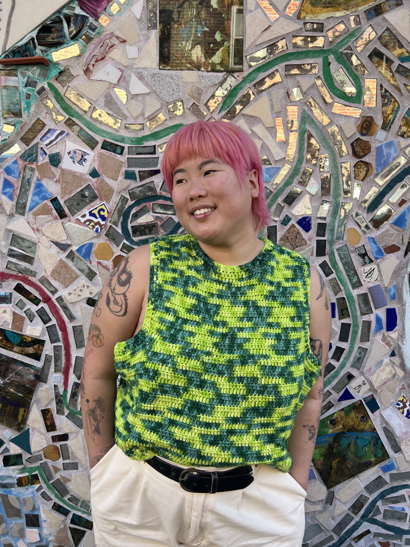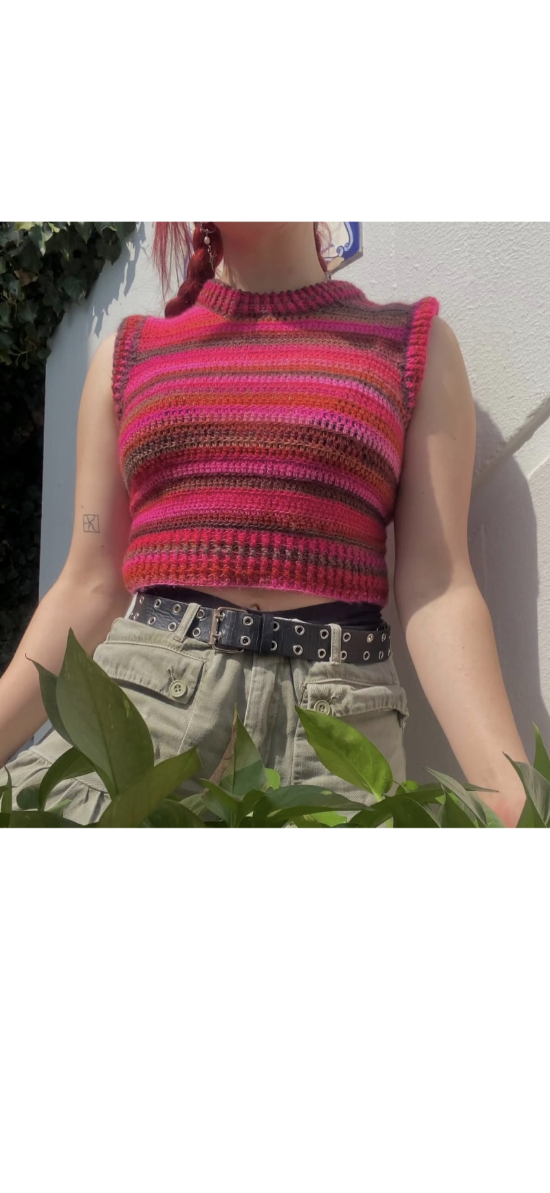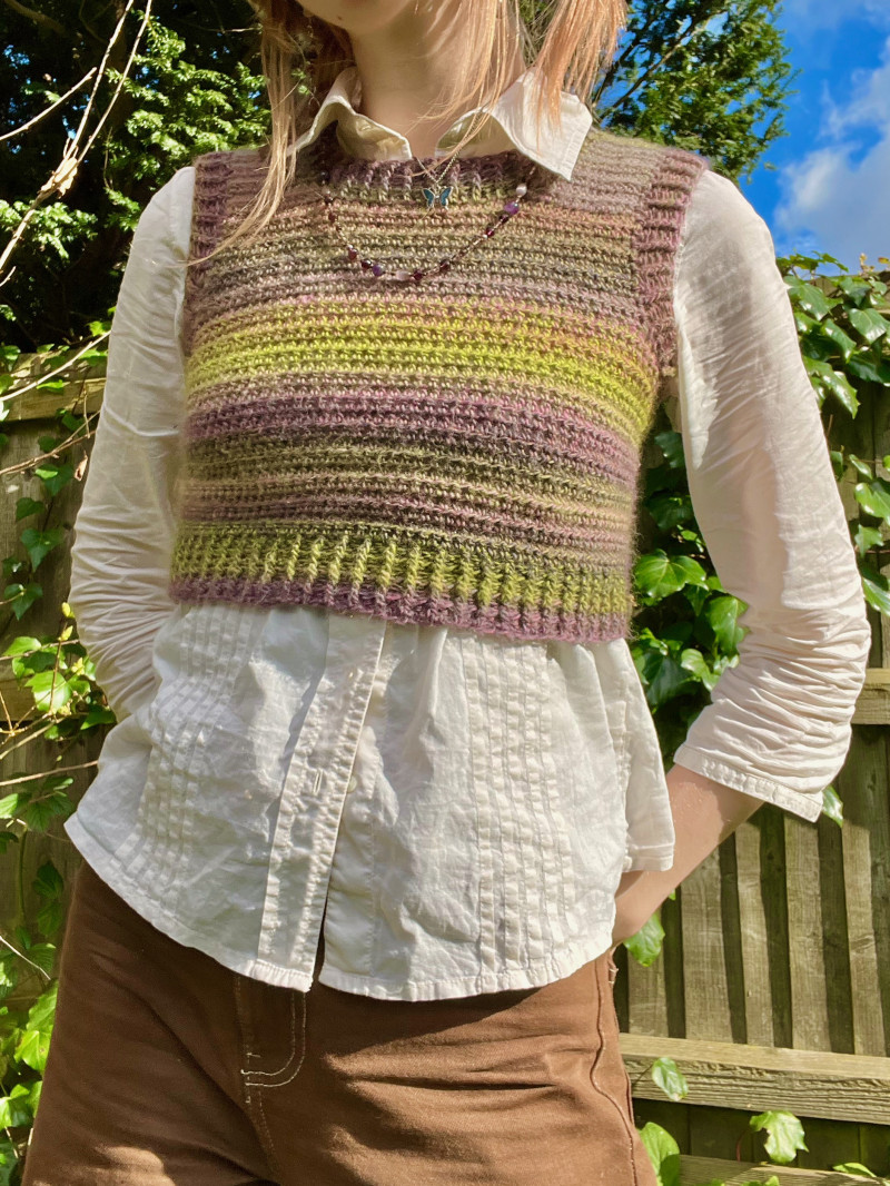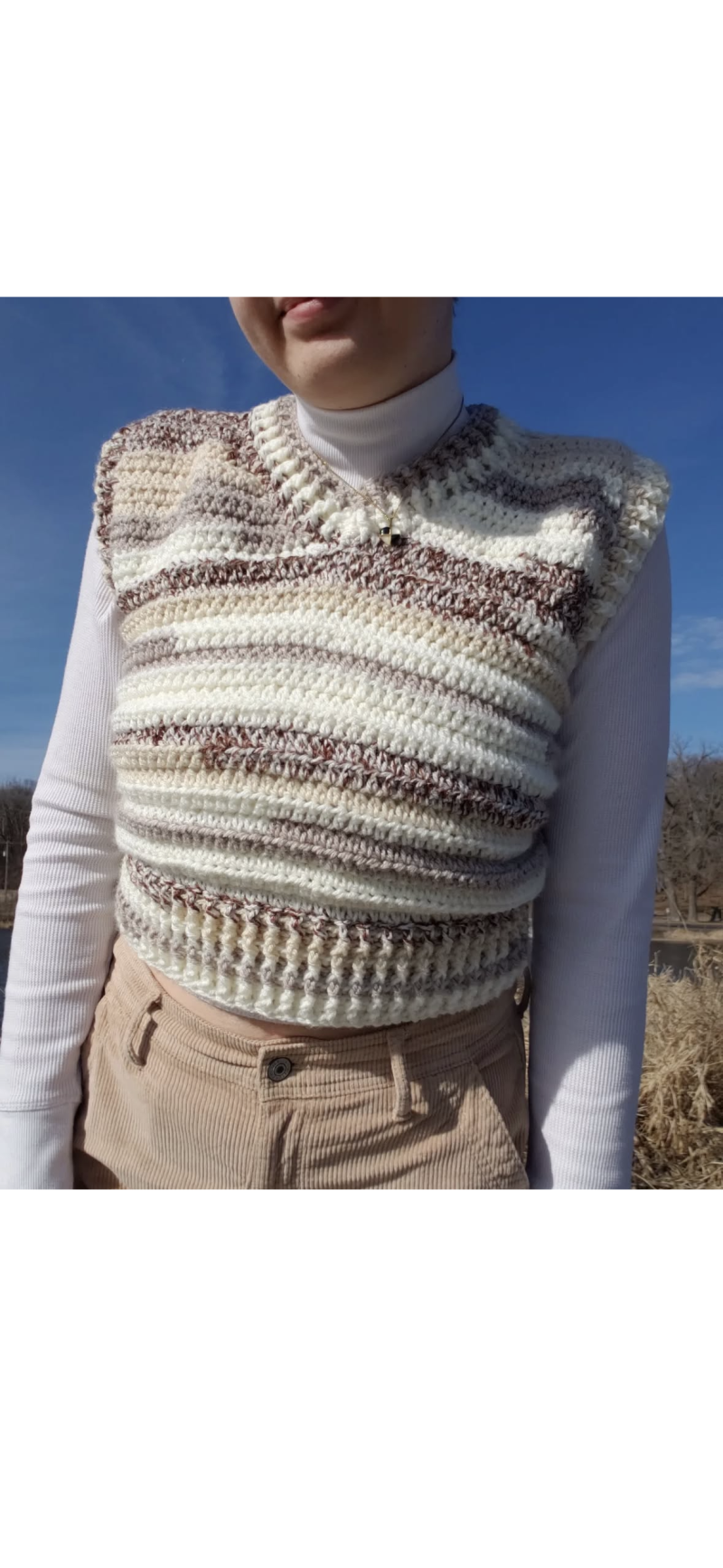 To achieve the look, I would recommend using variegated yarn, but you can make a solid-colored version or even use scraps if you’d like! The pattern is perfect to showcase your creativity and your beautiful yarn! most of my testers were eager to make at least another version of the vest since it’s so customizable.