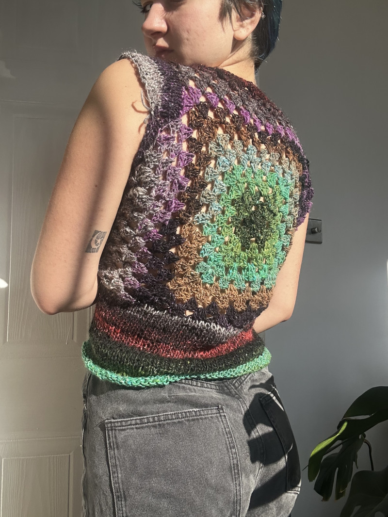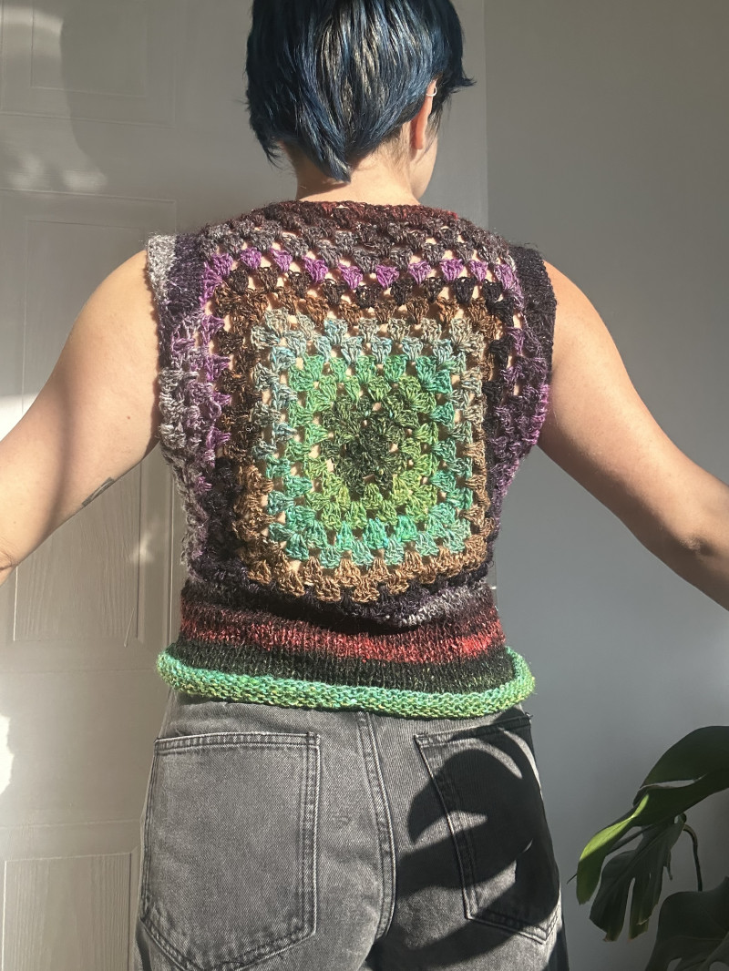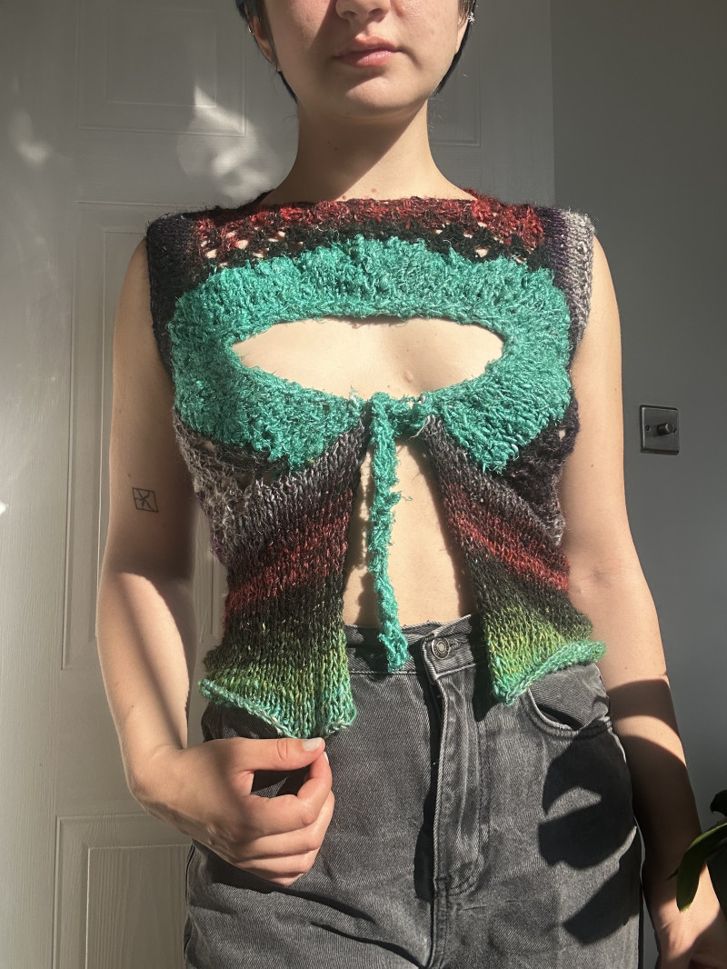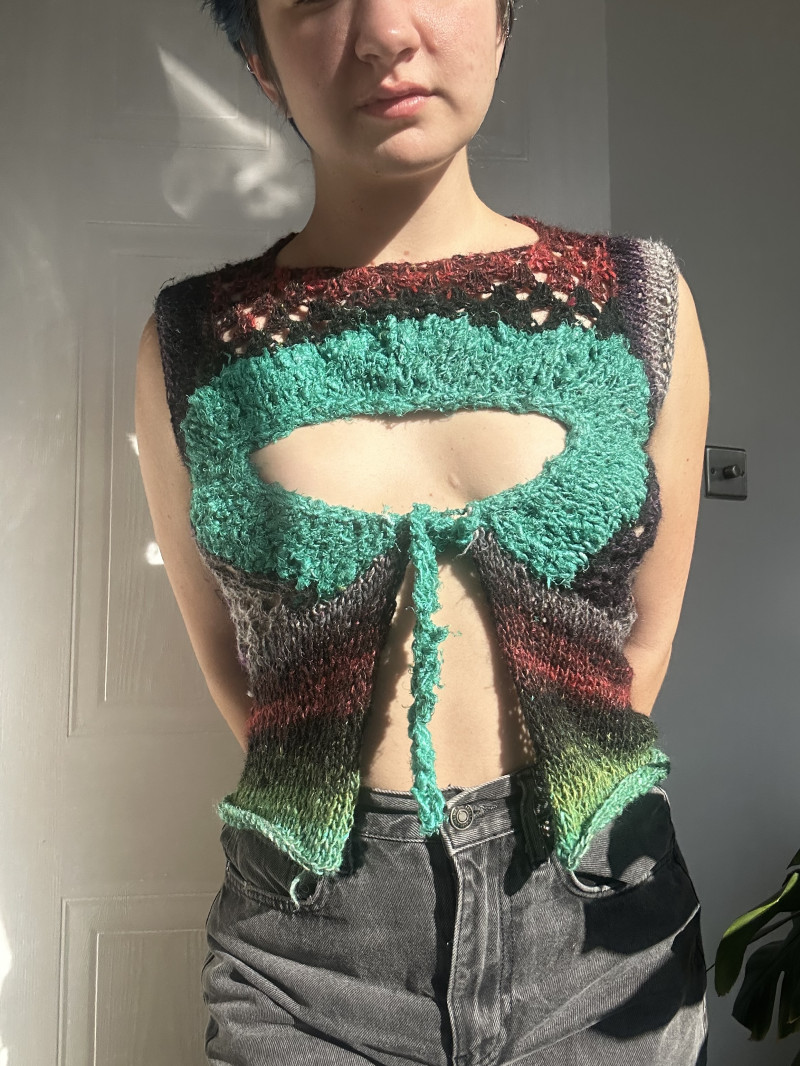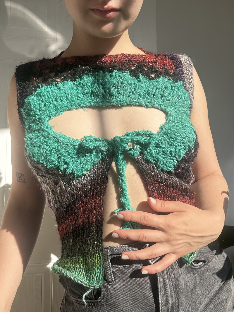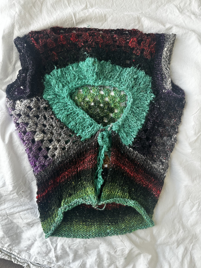 Made out of recycled silk for the keyhole part and wool, silk and cotton blend from noro for the main body.